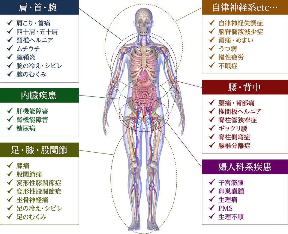 難治性の腰痛、ヘルニア、狭窄症、四十肩五十肩、膝痛、坐骨神経痛、股関節痛、自律神経失調症、内臓疾患、肝機能障害、子宮筋腫、卵巣嚢腫、うつ病、不定愁訴…