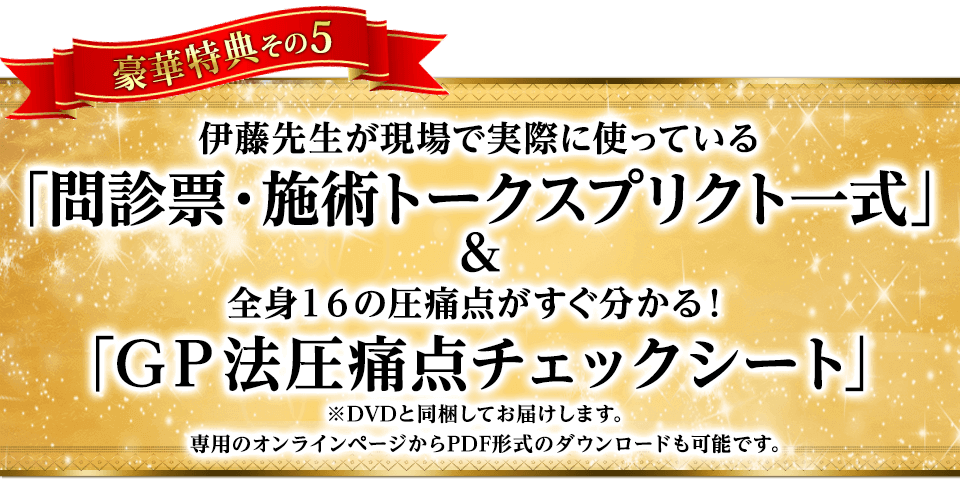 実際に伊藤先生が現場で使っている資料一式と圧痛点のチェックシートを特別にプレゼントします。